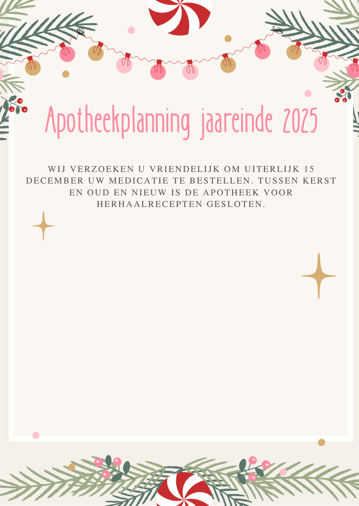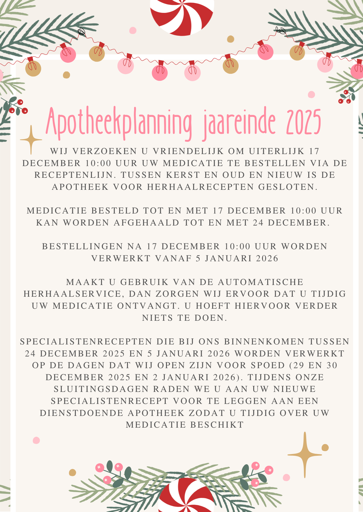 Wij raden u aan uw medicatie tijdig te bestellen, bij voorkeur minimaal 2 weken van tevoren. Met name in vakantieperiodes kan het in de apotheek drukker zijn dan gebruikelijk. Heeft u 7 dagen na het bestellen van de medicatie van ons nog geen bericht ontvangen, neemt u dan uit eigen beweging contact op met ons team. Mogelijk is er dan iets misgelopen.